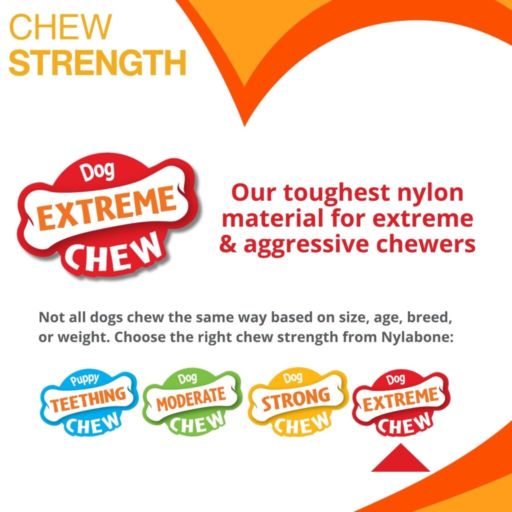 The Nylabone Extreme range of bones and chew toys are just right for your dog if he loves to chew, and is very good at it! Designed as an easy hold dog chew toy for a more comfortable chew, these chew toys have a delicious chicken flavour throughout, meaning the flavour goes on for as long as the chew does, they are not sprayed, dipped or coated in any way so there is no chance of that tasty flavour being licked off! The materials are as tough as real bones but they don't have the same dangers.