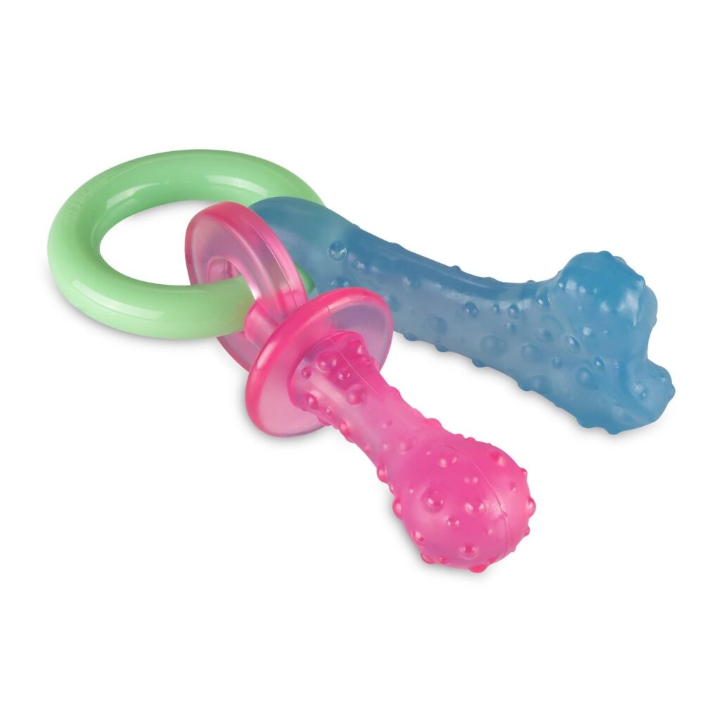 Nylabone have perfect the selection of teething puppy chew toys with chews to satisfy their natural urge to chew made from strong material to withstand their sharp teeth but enough give to allow for their teeth and jaw to strengthen. Puppies use their mouths to explore their surroundings, to play, and especially to relieve teething discomfort. With positive reinforcement, pups will learn that chewing on Nylabone Puppy Chews is not only encouraged, but also a fun pastime to enjoy into adulthood!