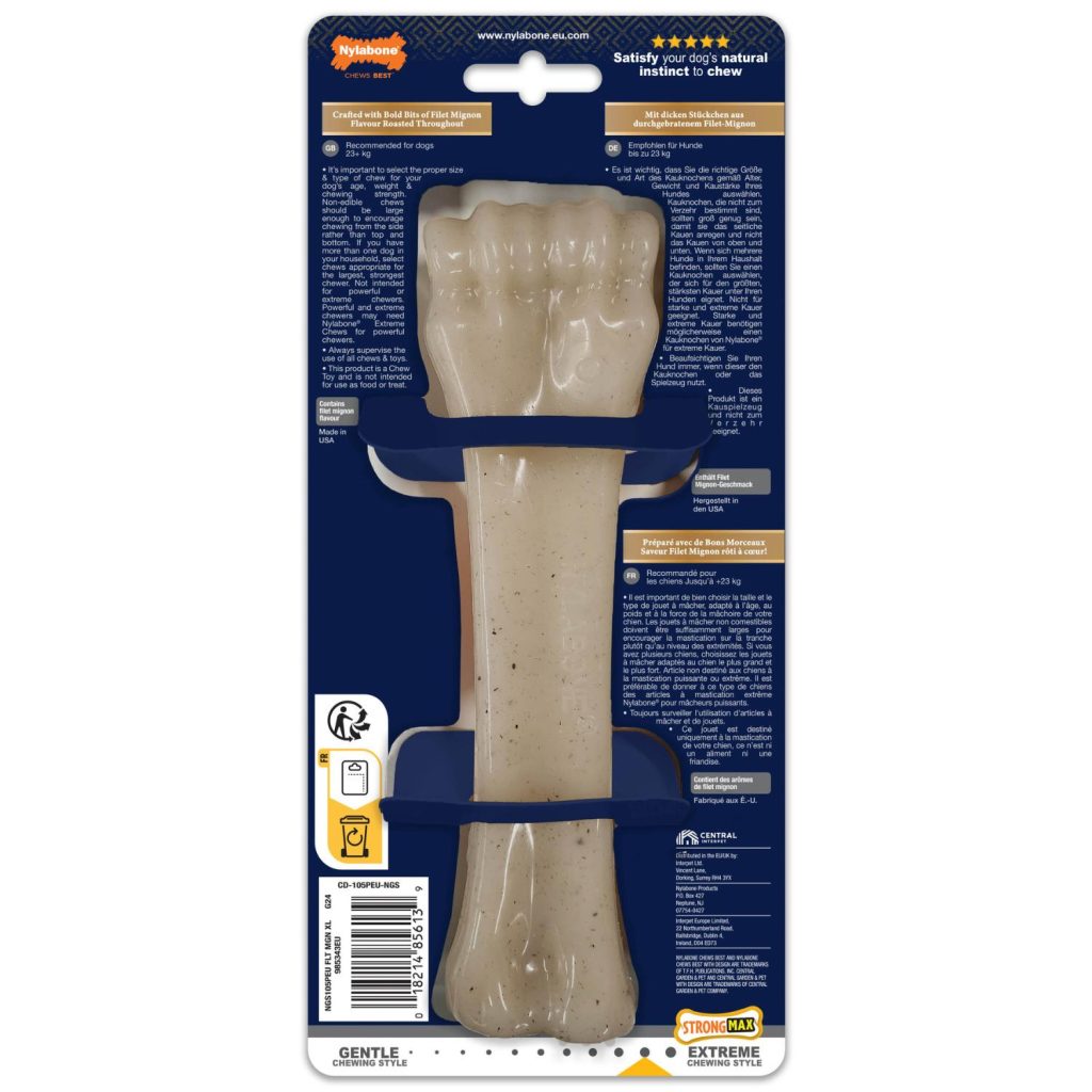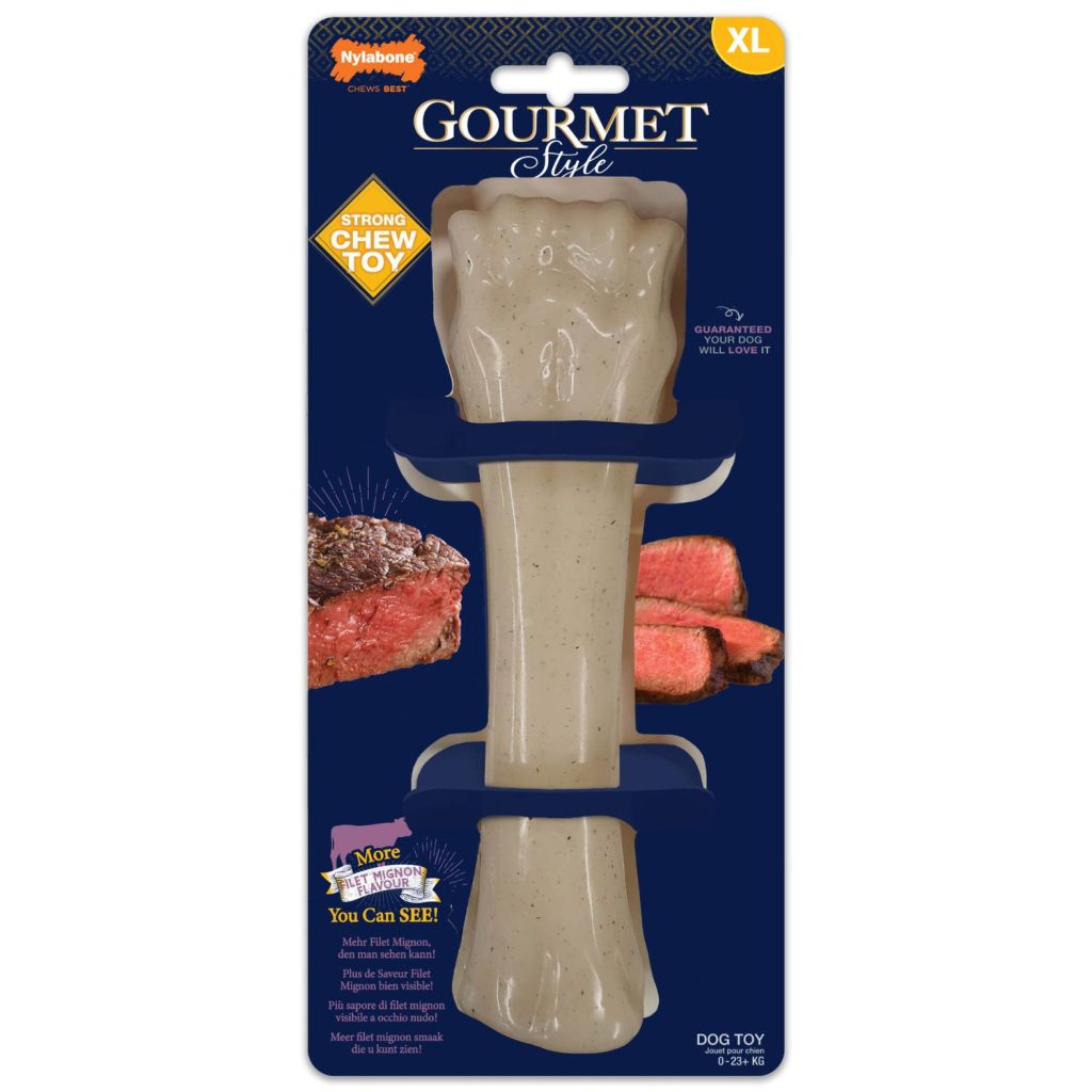 The Nylabone Gourmet range of bones and chew toys are just right for your dog if he loves to chew and loves BIG BOLD flavour! This chew toy has a delicious gourmet filet mignon flavour throughout, meaning the flavour goes on for as long as the chew does, they are not sprayed, dipped or coated in any way so there is no chance of that tasty flavour being licked off! They also have chunks of flavour infused throughout to add even more flavour to make it lip-smackingly tasty! The materials are as tough as real bones but they dont have the same dangers.
